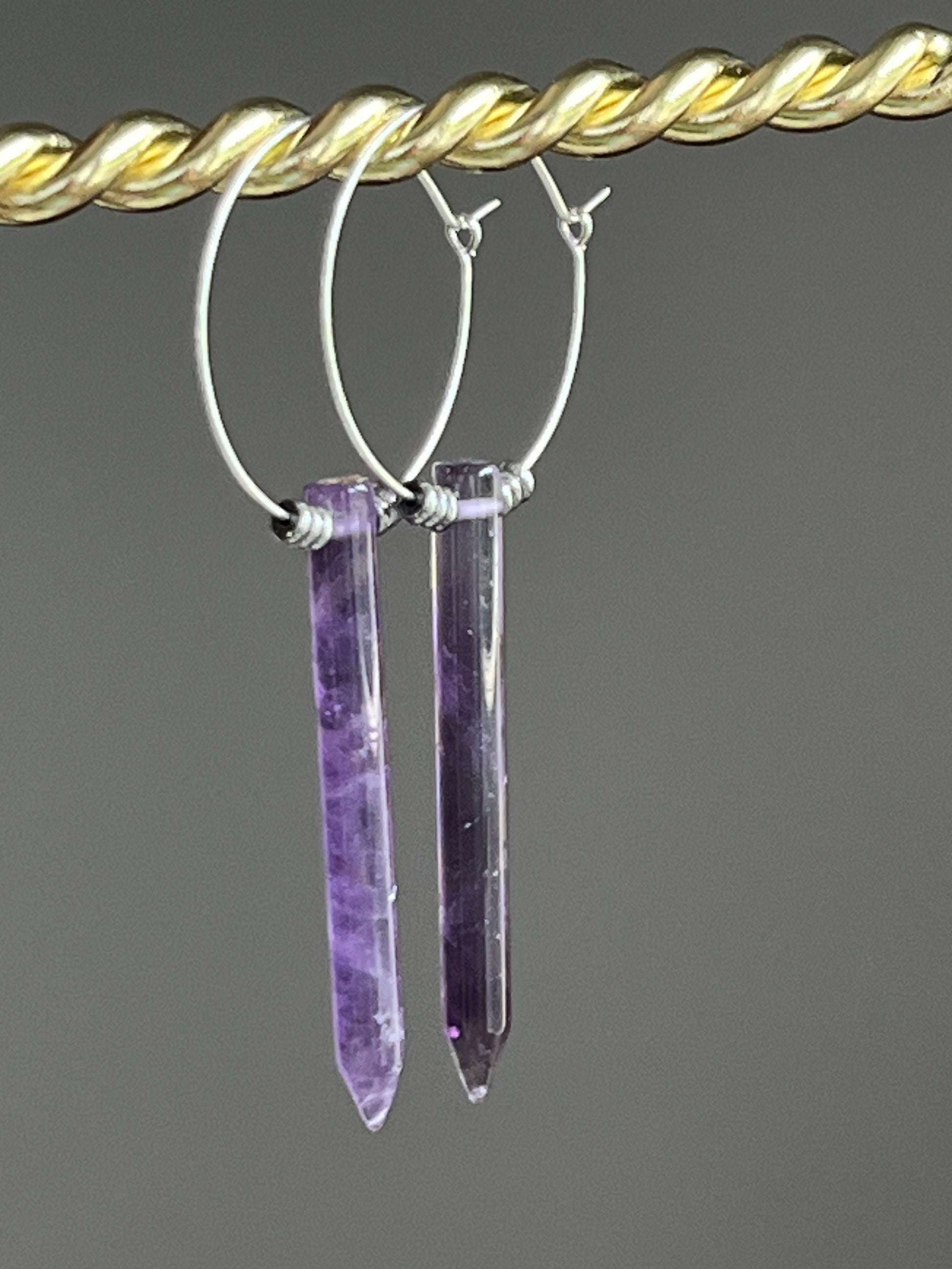 AMETHYST POINT w/ SILVER HEMATITE HOOPS | GEMSTONE CRYSTAL Earrings