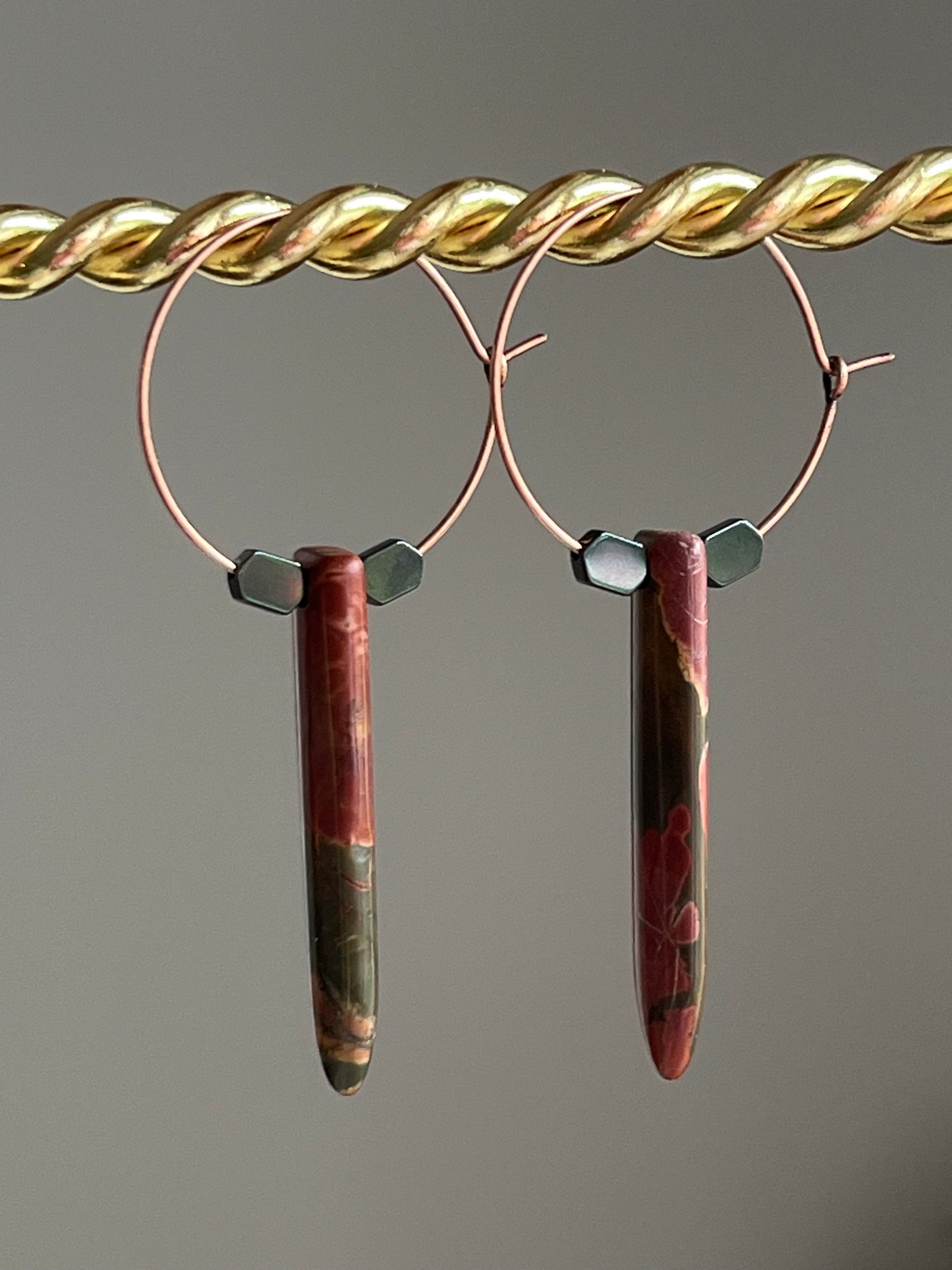 Cherry Jasper Puff Dagger Hoop Gemstone Earrings | Antique Copper-plated Wire | 1” Hoop | *MADE TO ORDER ~ Colors of natural stones may vary slightly.