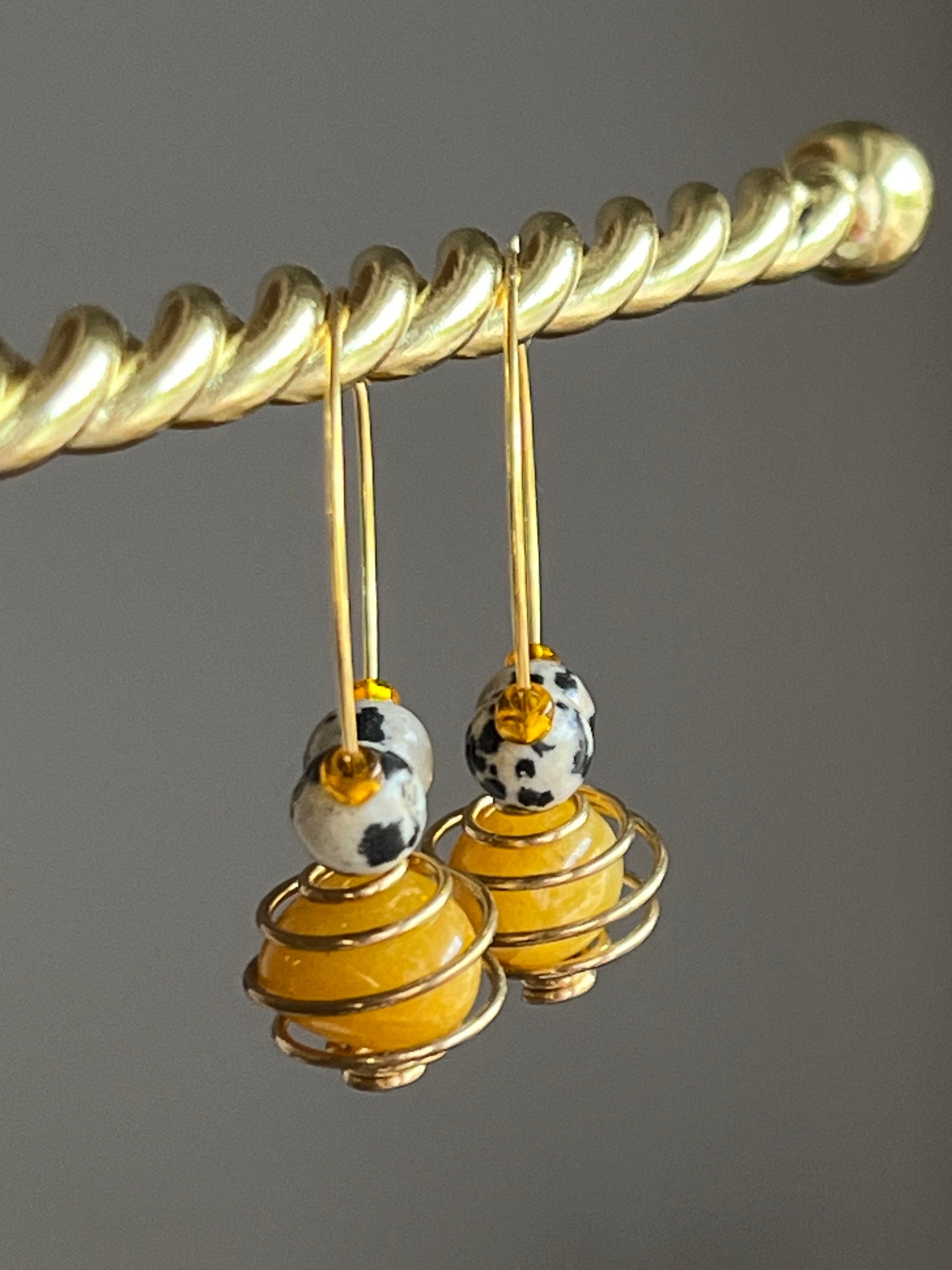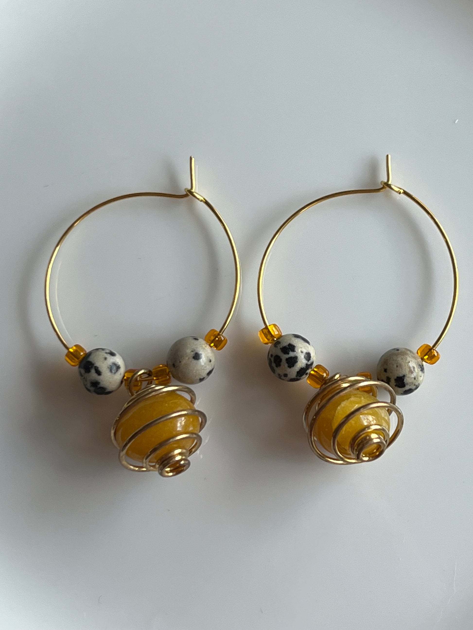 Yellow Aventurine + Dalmatian Jasper Caged Hoop Gemstone Earrings | Gold-plated Wire | 1” Hoop